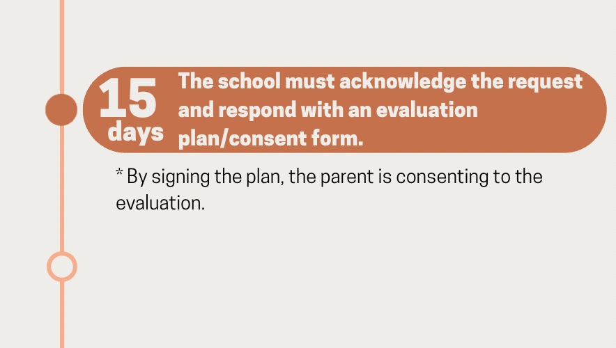 The process begins the moment a parent or legal guardian submits a request for a special education evaluation to the school district. I always recommend sending the request by email. Paper notes can get lost, but emails create a record and are easy to track. Your request can be simple. Address it to the principal, your child’s teacher, and (if known) the special education teacher. For example: “Hello, I am [Child’s Name]’s parent. I would like to formally request a full special education evaluation.” You may include your concerns such as difficulties with reading comprehension, auditory processing, attention, or social skills but it’s not required.